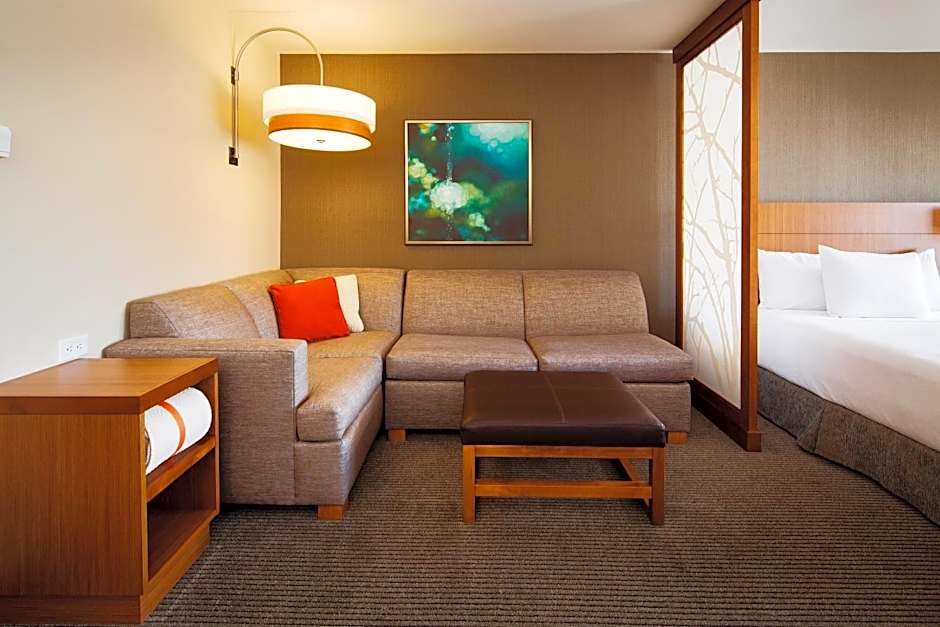 This suite offers a separate seating area, flat-screen cable TV and work desk.